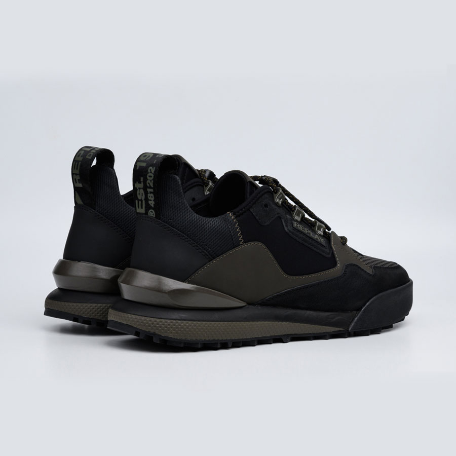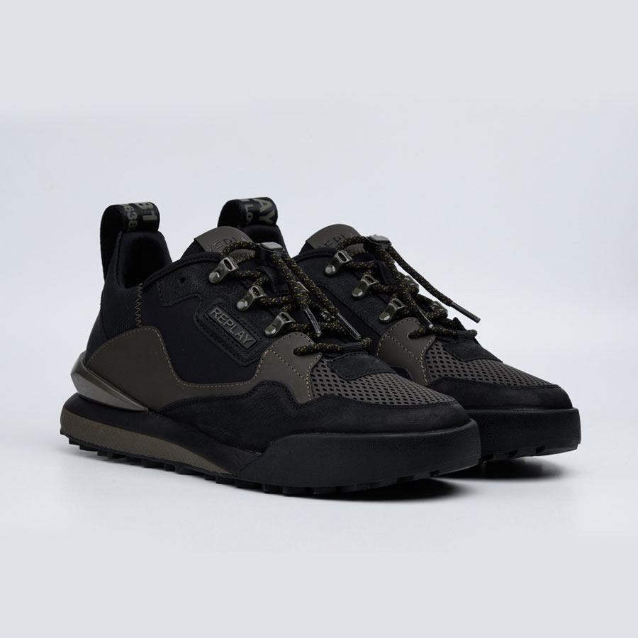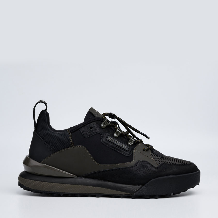 Αθλητικά παπούτσια με κορδόνια και δερμάτινο επάνω μέρος, με ένθετα από νάιλον και σουέτ για ένα σπορ και casual ντύσιμο. Το ανάγλυφο γράμμα Replay υπάρχει στο πλάι, στη γλώσσα, στην προσαρμοσμένη ταινία έλξης στη φτέρνα και στην ταινία στο κουμπωτό άγκιστρο για σύνδεση στα κορδόνια. Η σόλα είναι από τεχνικό υλικό.